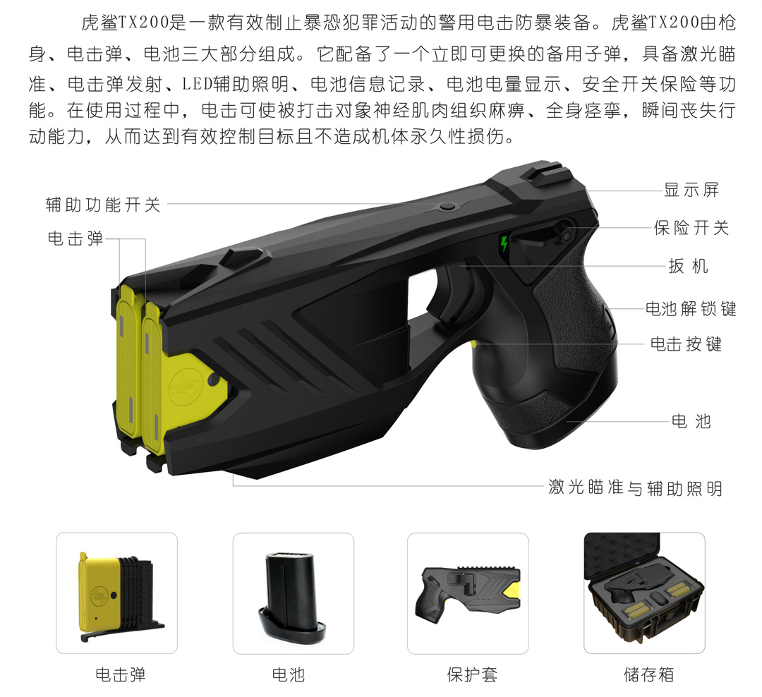 拥有完全知识产权的“虎鲨”TX100,凭借着其独特的瞬间制服能力,在国内执法领域深受一线民警的认可。民盾安全此次倾力研发的“虎鲨”系列新产品,通