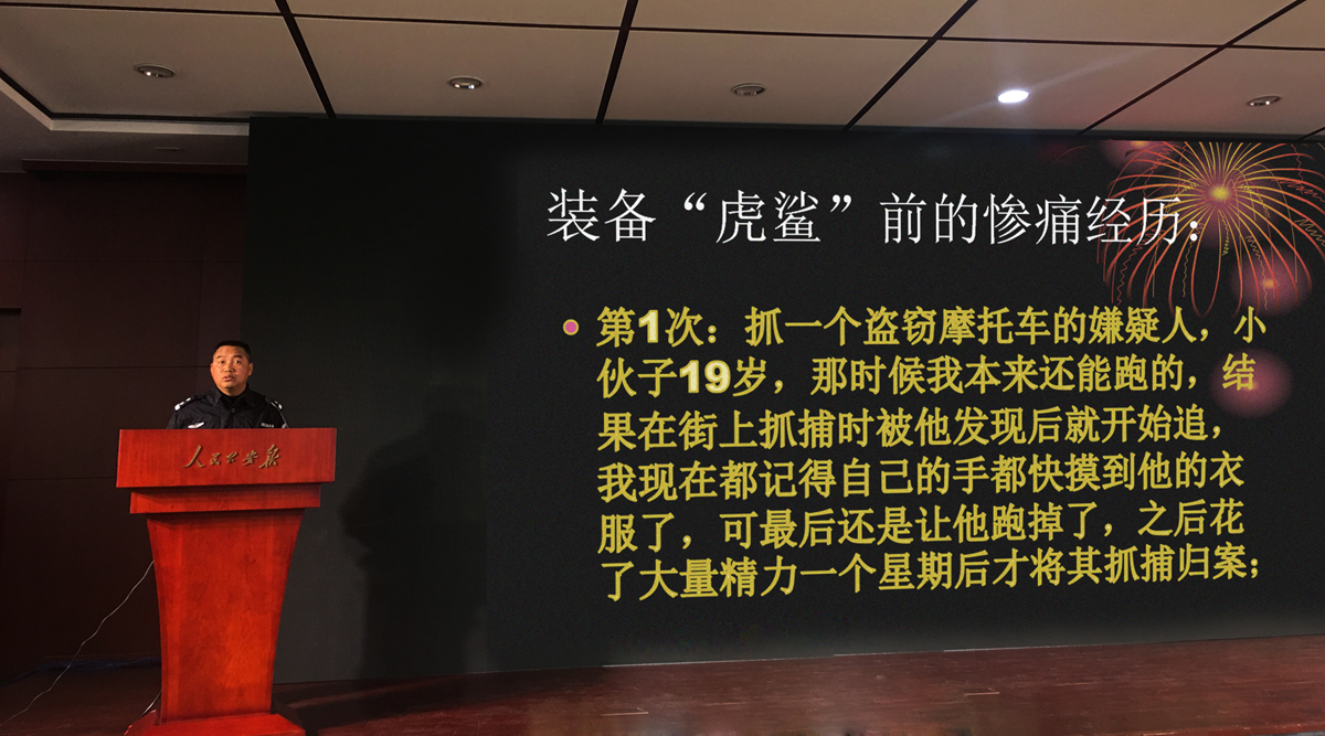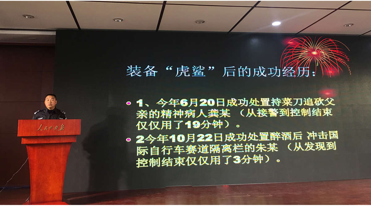 2017年12月26日,第七届全国警用装备品牌发展研讨会暨全国公安民警最关注的警用装备品牌颁奖仪式在人民公安报社举办,来自全国各地公安机关领导、专家、民警及获奖企业代表近200人参加了本次活动。 本届研讨会以“提升警用装备创新与保障能力”为主题,虎鲨团队与各企业代表一起认真聆听了公安机关领导、专家们就当前警用装备事业发展,尤其是警用装备科技创新、科技强警等前沿技术与公安实战相结合 应用而发表的深度见解。 作为新型非致命性警用装备推广先行者,虎鲨团队自主研发的电击枪,凭借产品独特的瞬间制服能力,融合国际前沿技术应用在众多优秀评选产品中脱颖而出,荣获“2018年全国公安系统警用装备十佳品牌”荣誉 称号。此活动经过资质审核、民警投票、专家评选等多个环节产生,并得到了全国各地公安机关的广泛关注和大力支持。 颁奖仪式上,虎鲨团队代表接受了人民公安报社领导的颁奖,并在现场就虎鲨目前取得的一些推广应用成果作了精彩分享发言。这一荣誉的摘得,离不开团队成员这些年来持续的努力与付出,并感谢全国各地的一些 警务实战教官对产品的指导与建议,感谢广警战协兄弟们的亲身测试和演练,同时还有一路走来帮助和关注虎鲨发展的人! 与此同时,来自桂林市公安局雁山分局大埠派出所的王邵文副所长, 就研讨会现场发表演讲。作为地方公安代表发言,王所站在基层一线民警执法角度,表达了目前对基层执法现状的看法,在分享虎鲨电击枪在实战 抓捕案例过程中,充分肯定电击枪在提升执法装备水平的贡献。 接下来,虎鲨团队将不忘初心,牢记使命,坚持以为人民警察服务为宗旨,坚持做好产品和服务,勇于创新,为我国自主警用装备品牌的发展贡献力量!希望全国各地的一线民警都能早日配上这样的新型装备,减少 牺牲和伤亡,让出警更安全,让执法不再受伤害!