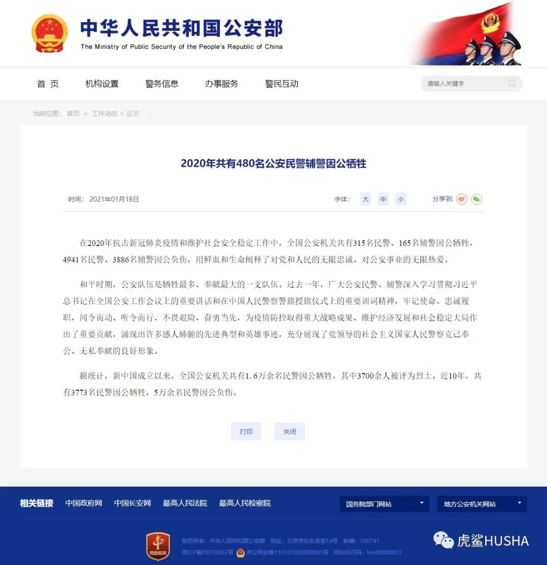 2020年共有480名公安民警、辅警因公牺牲。