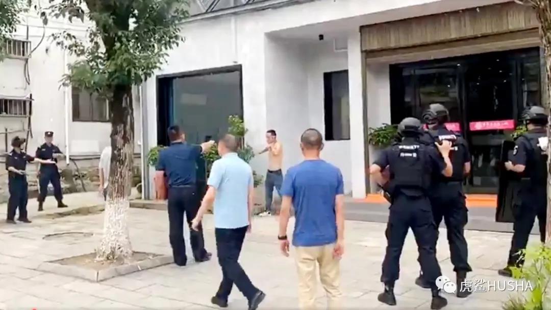 (上身赤裸男子持刀欲自残,多名民警赶赴现场劝阻↑)