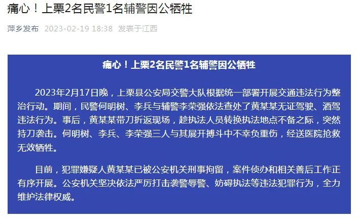 近日,江西省萍乡市上栗县2名民警1名辅警查酒驾时被刺,因公牺牲,引发关注。2月19日18时许,“萍乡发布”通报最新情况:
