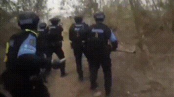 肇事男子持刀砍杀后逃逸至树林躲藏,接报单位民警展开树林搜捕行动。在距离约10米处发现犯罪嫌疑人迎面冲杀过来,围捕民警果断击发防暴器,先后击发催泪弹和电击弹进行战术控制,肇事男子被击中后瞬间倒地并失去反抗能力。配合盾牌及钢叉,民警夺去嫌犯手中刀器并迅速将其抓捕归案。