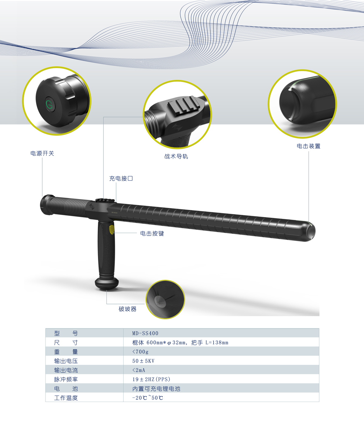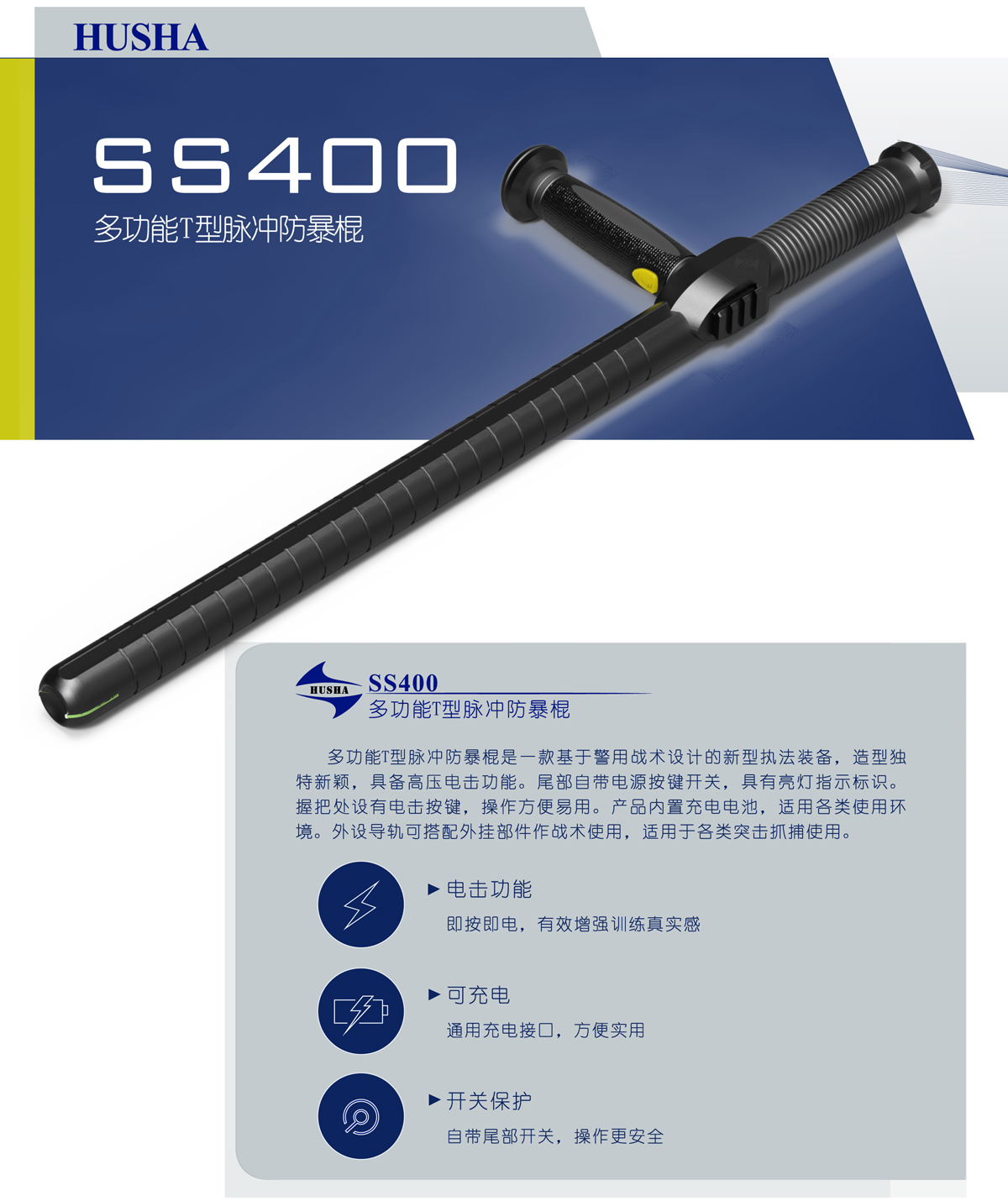 SS400多功能T型脉冲防暴警棍是一款基于警用战术设计的新型执法装备,造型独特新颖,具备高压电击功能。尾部自带电源按键开关,具有亮灯指示标识。握把处设有电击按键,操作方便易用。产品内置充电电池,适用各类使用环境。外设导轨可搭配外挂部件作战术使用,适用于各类突击抓捕使用。